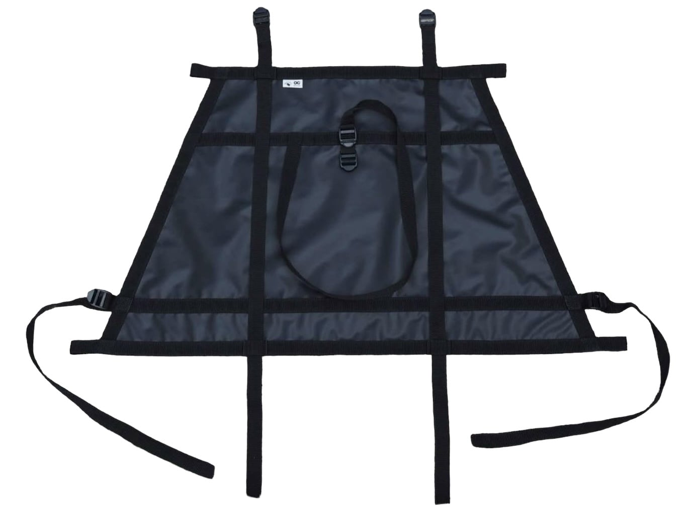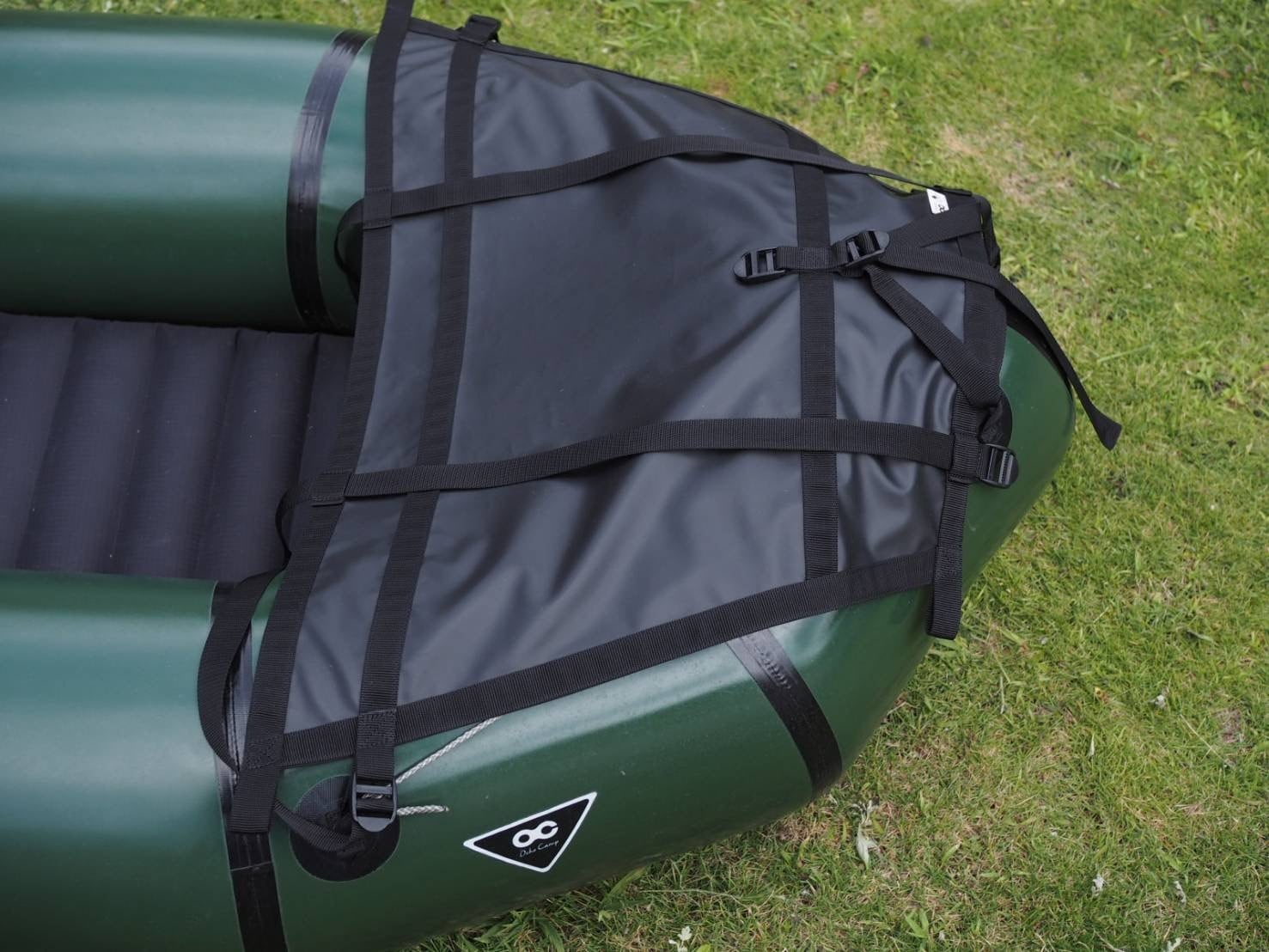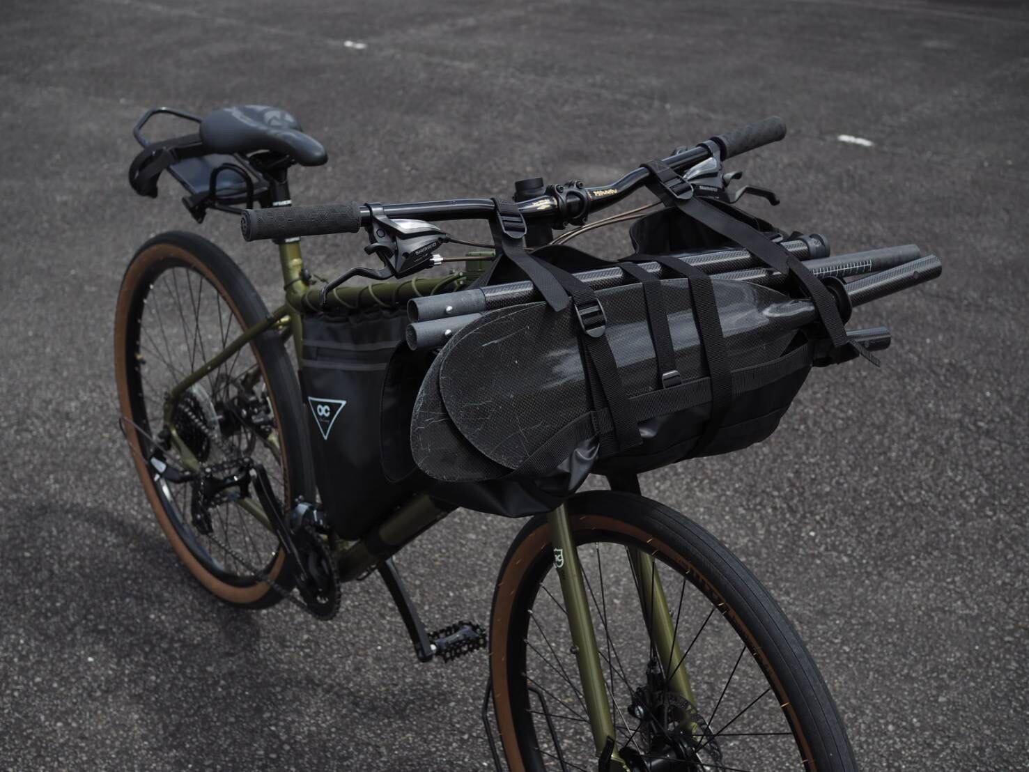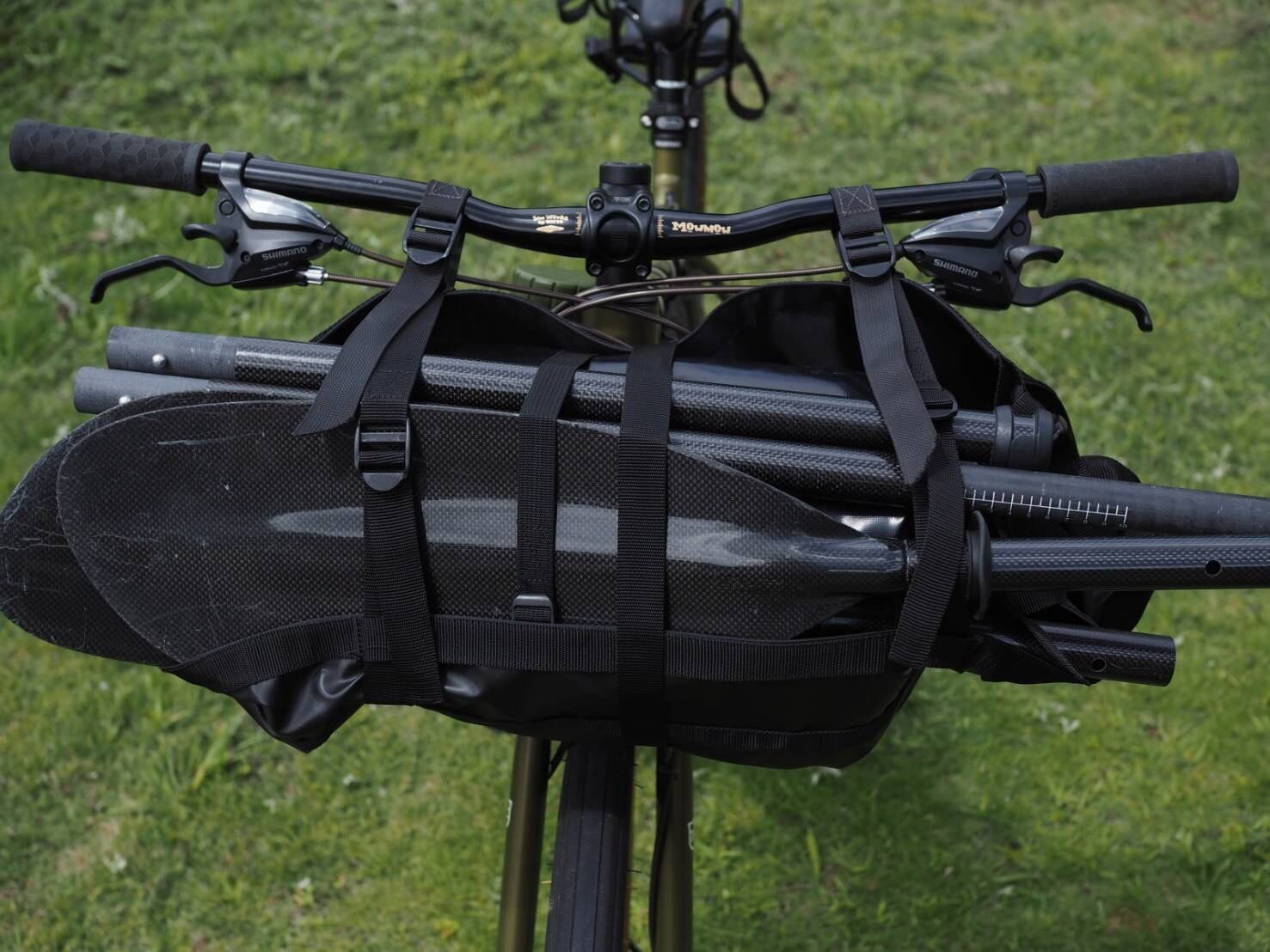 ・自転車で使用するときは畳んだパックラフトを包み込んで付属のストラップでハンドルに取り付けます